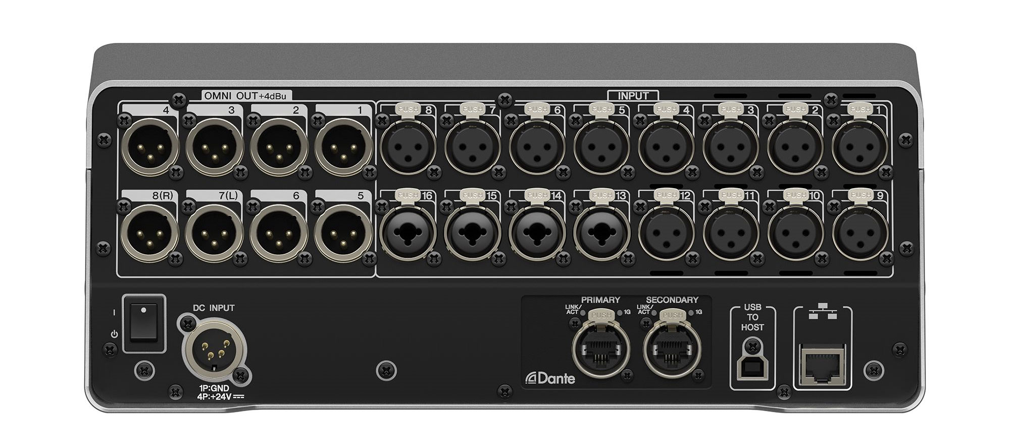 本地I/O:16个麦克风/线路(12个XLR + 4个XLR/TRS Phones Combo)输入,8个(XLR)输出